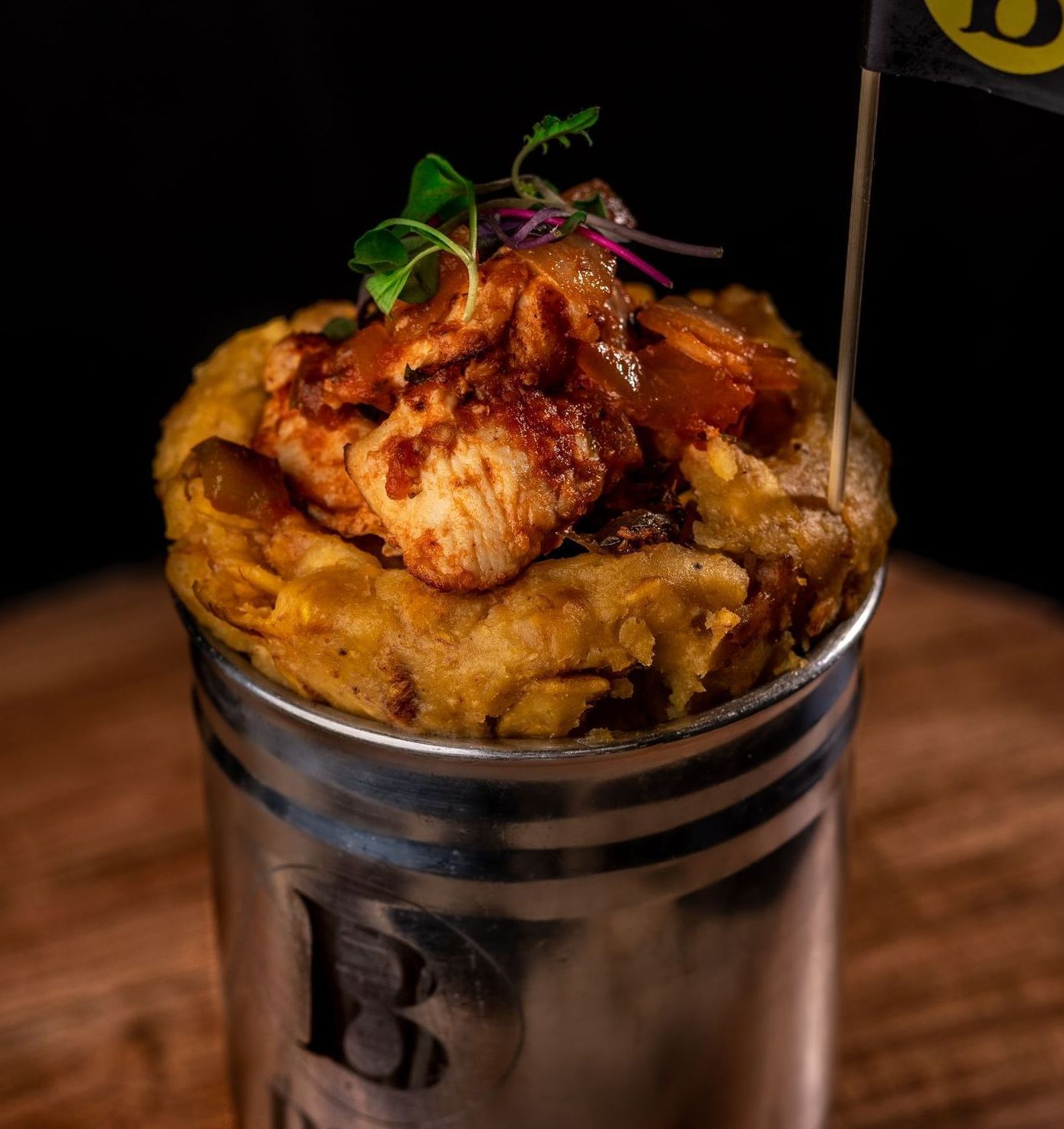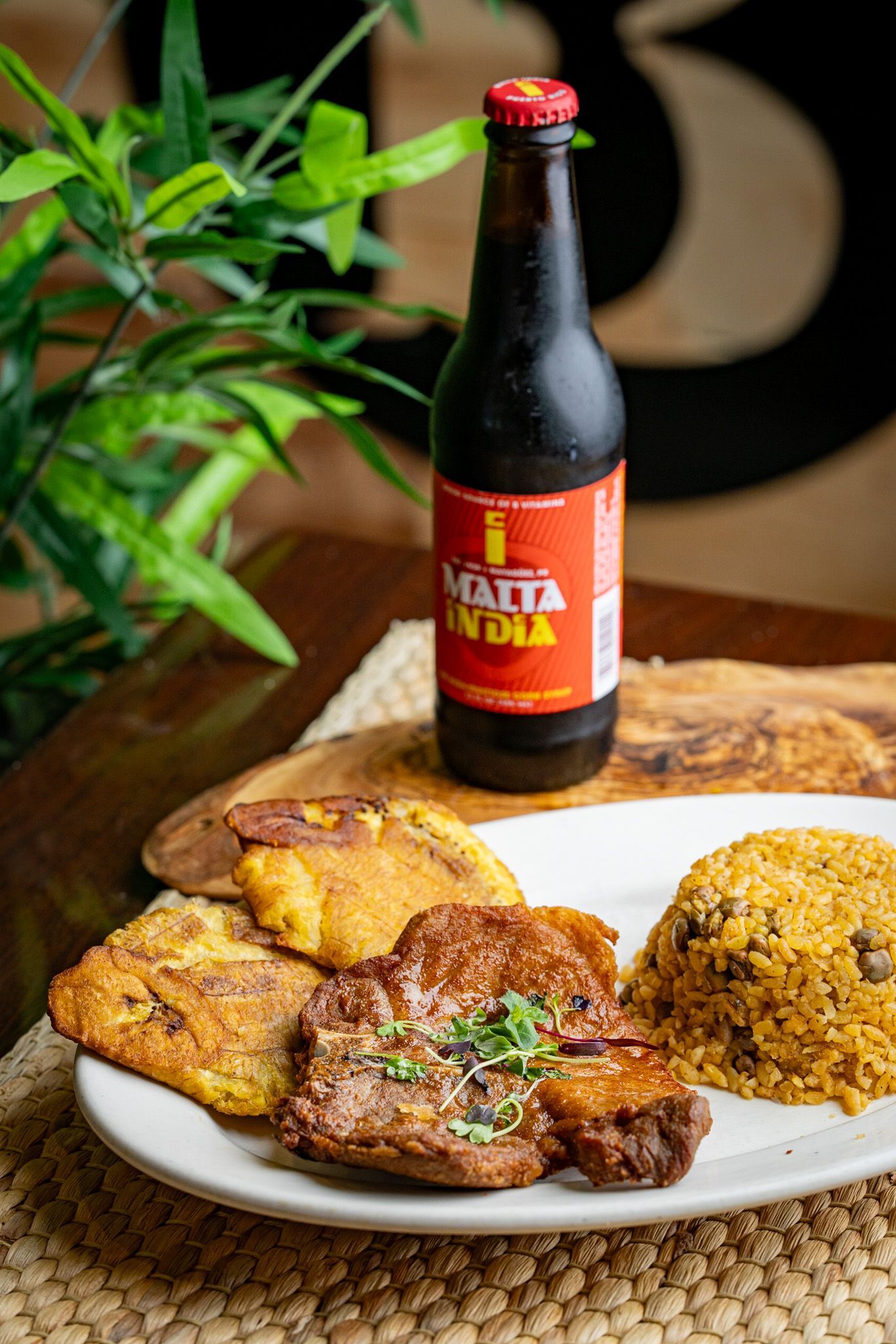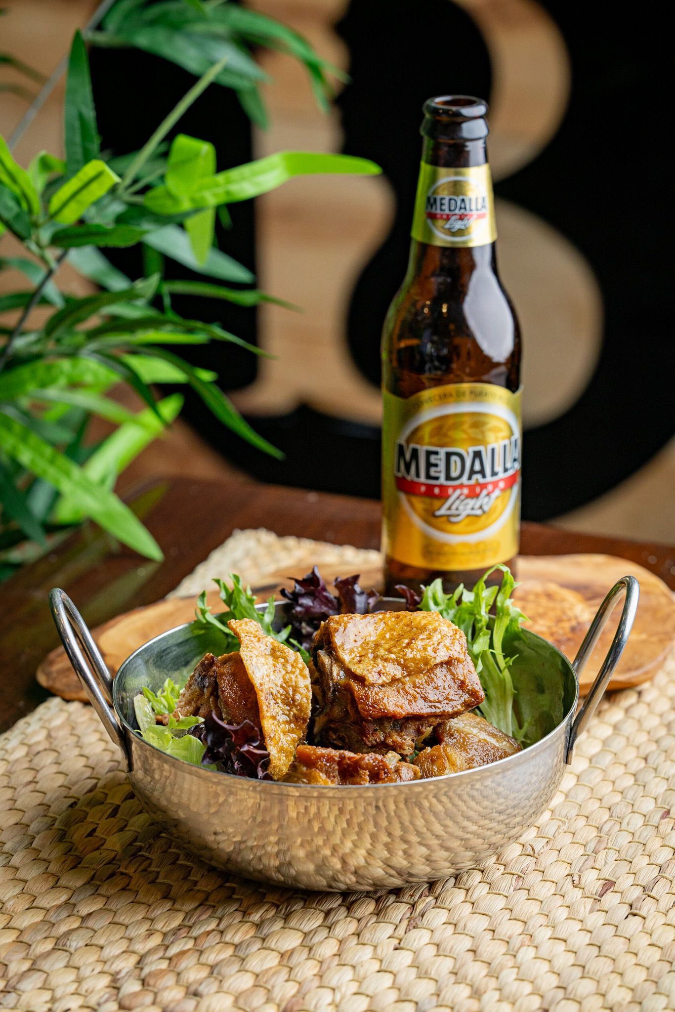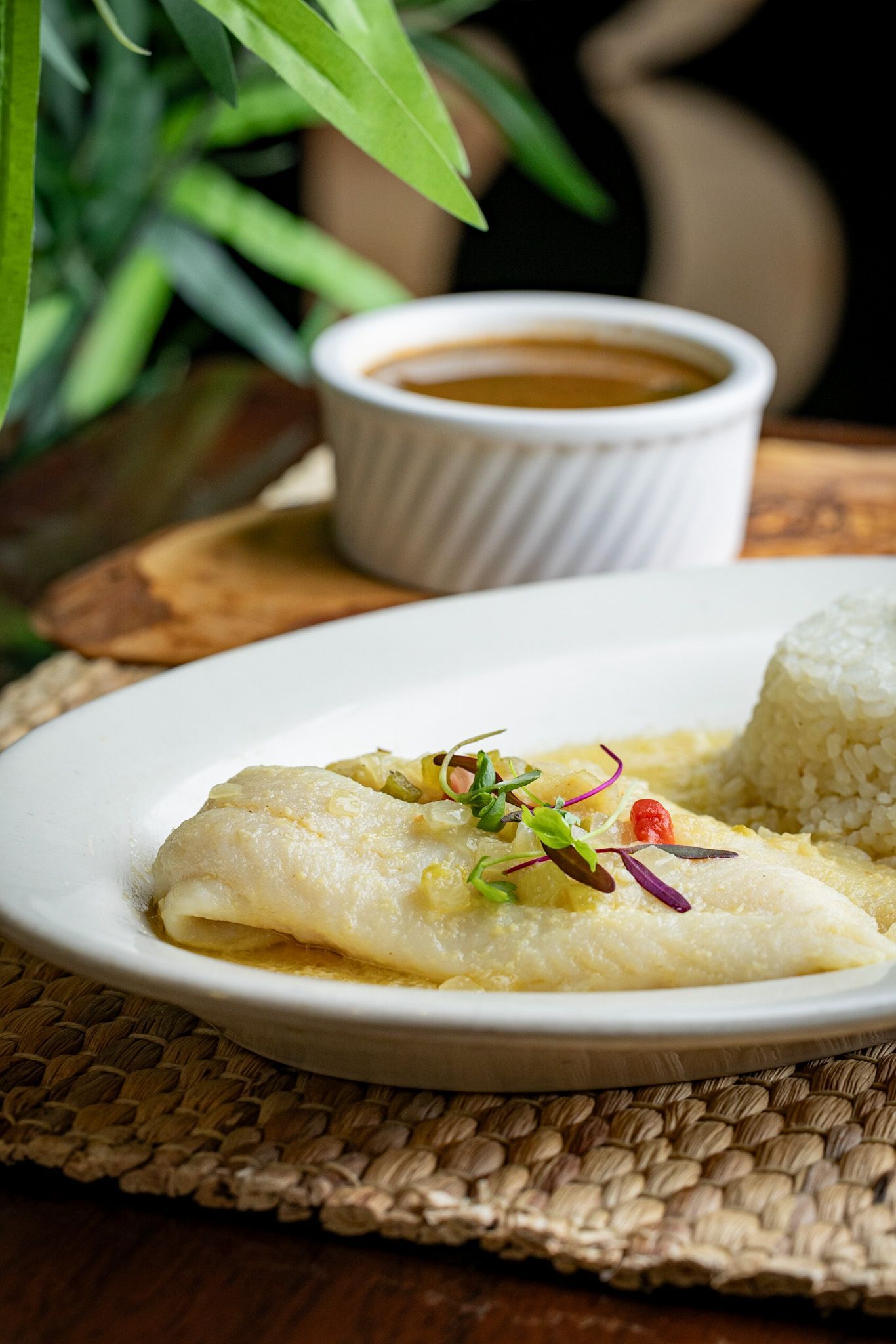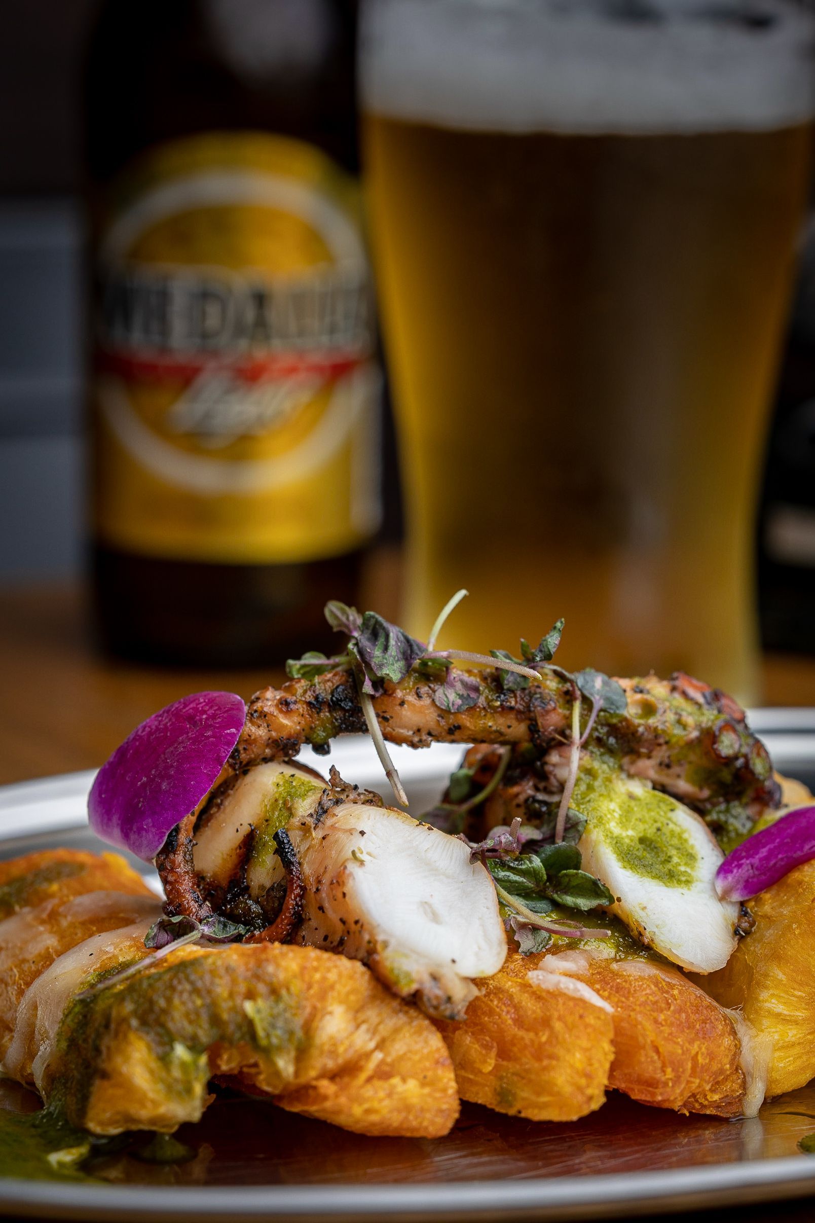 Chillo Entero con pinchos de Camarones, ensalada de Pulpo, arroz y tostones.