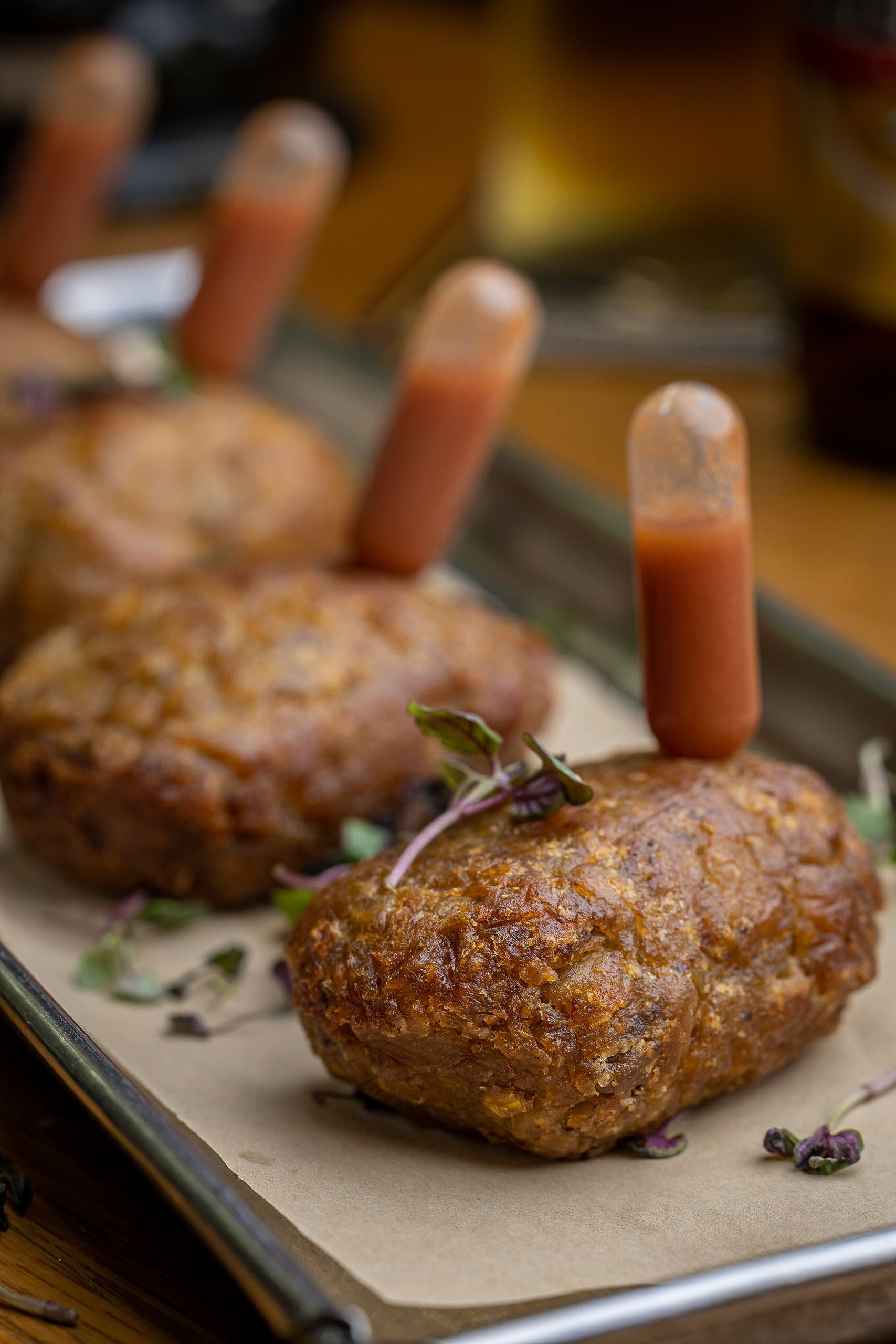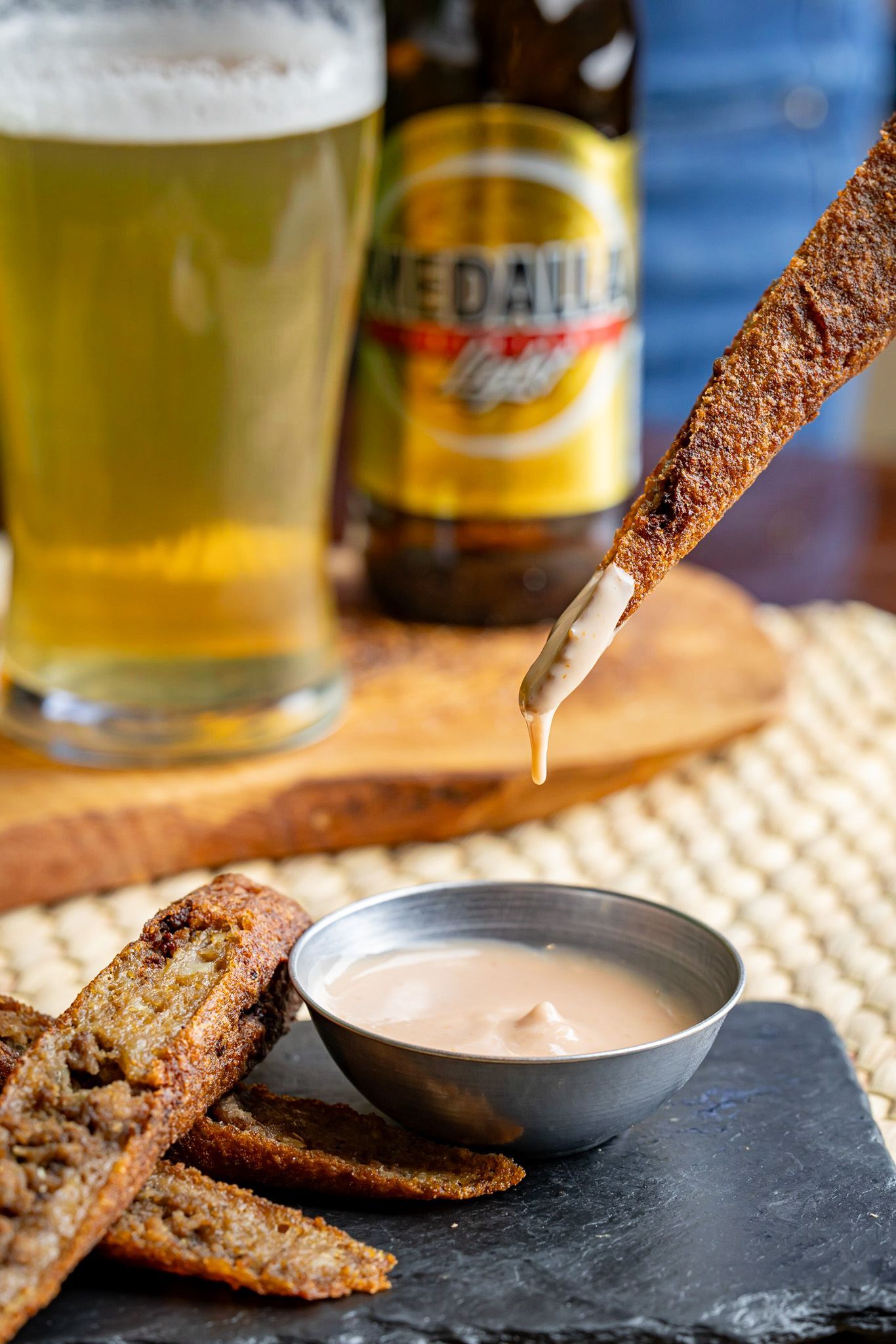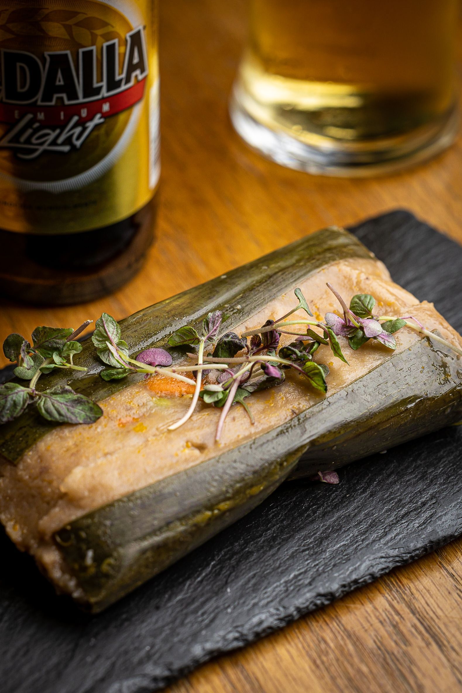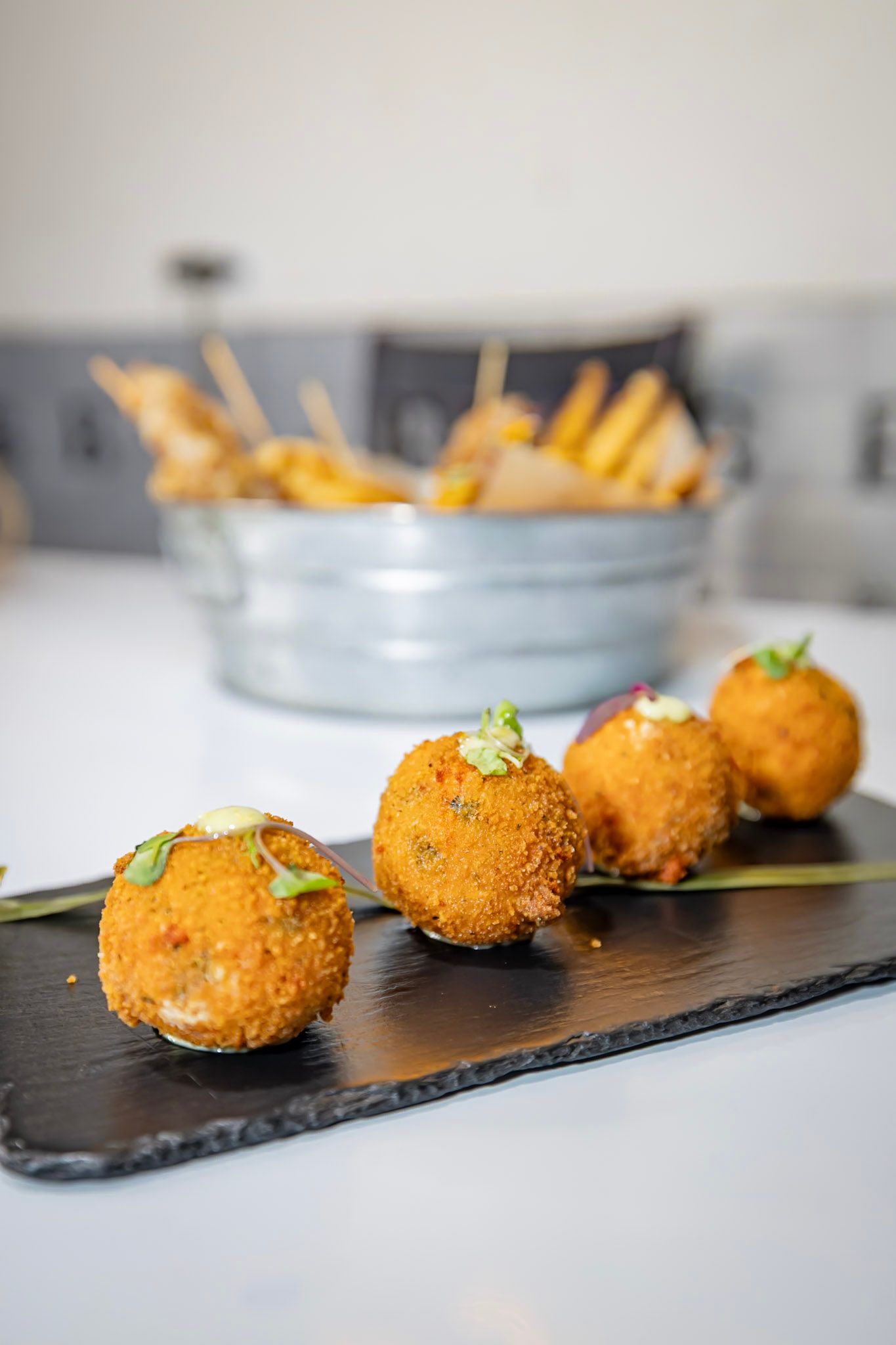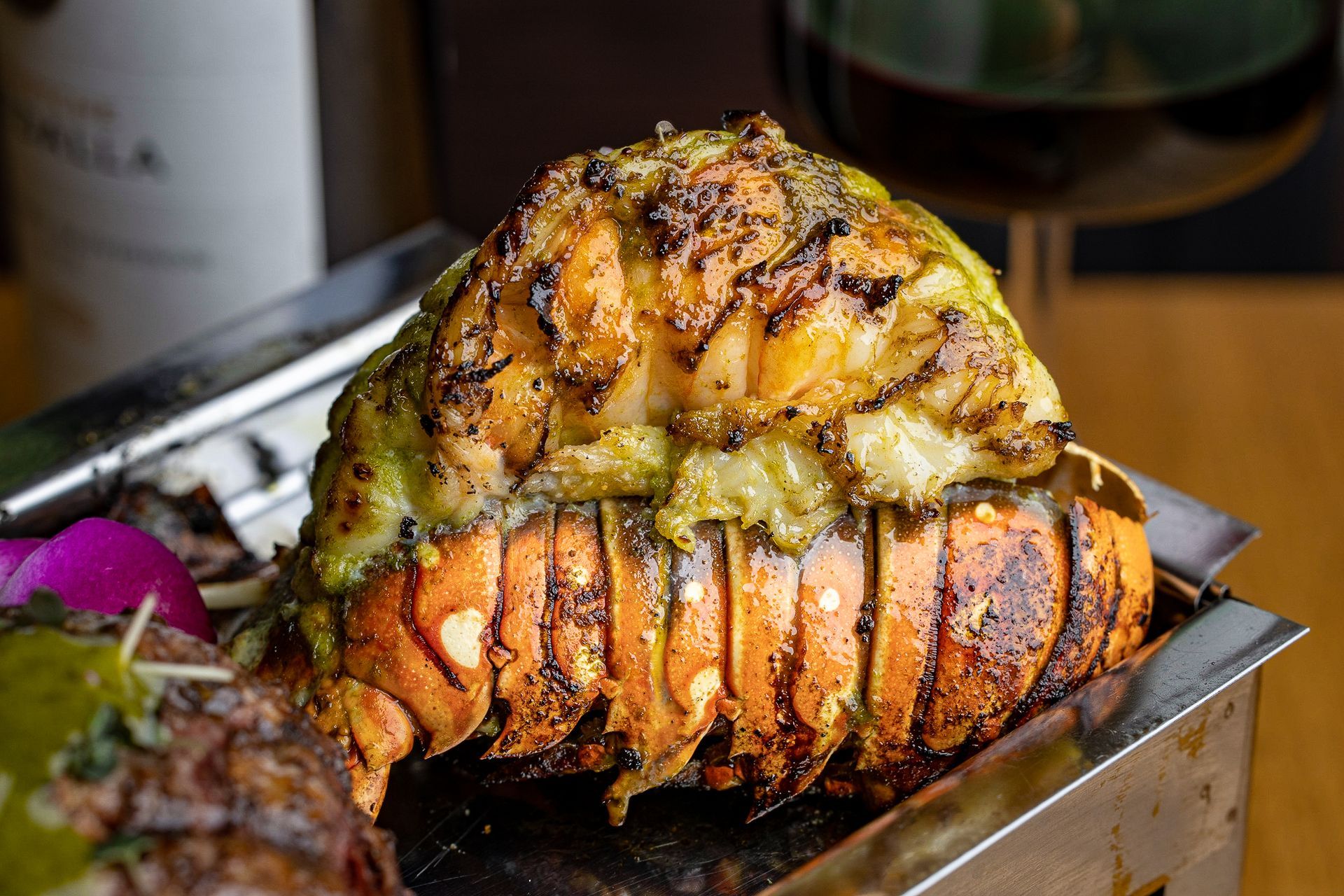 Chillo Entero con pinchos de Camarones, ensalada de Pulpo, arroz y tostones.