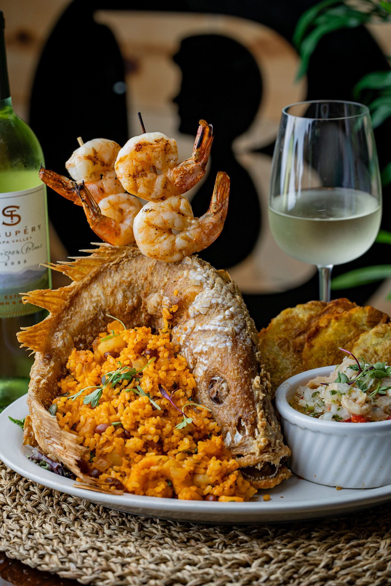 Whole Fried Snapper, grilled shrimp, octopus salad rice and fried plantain.